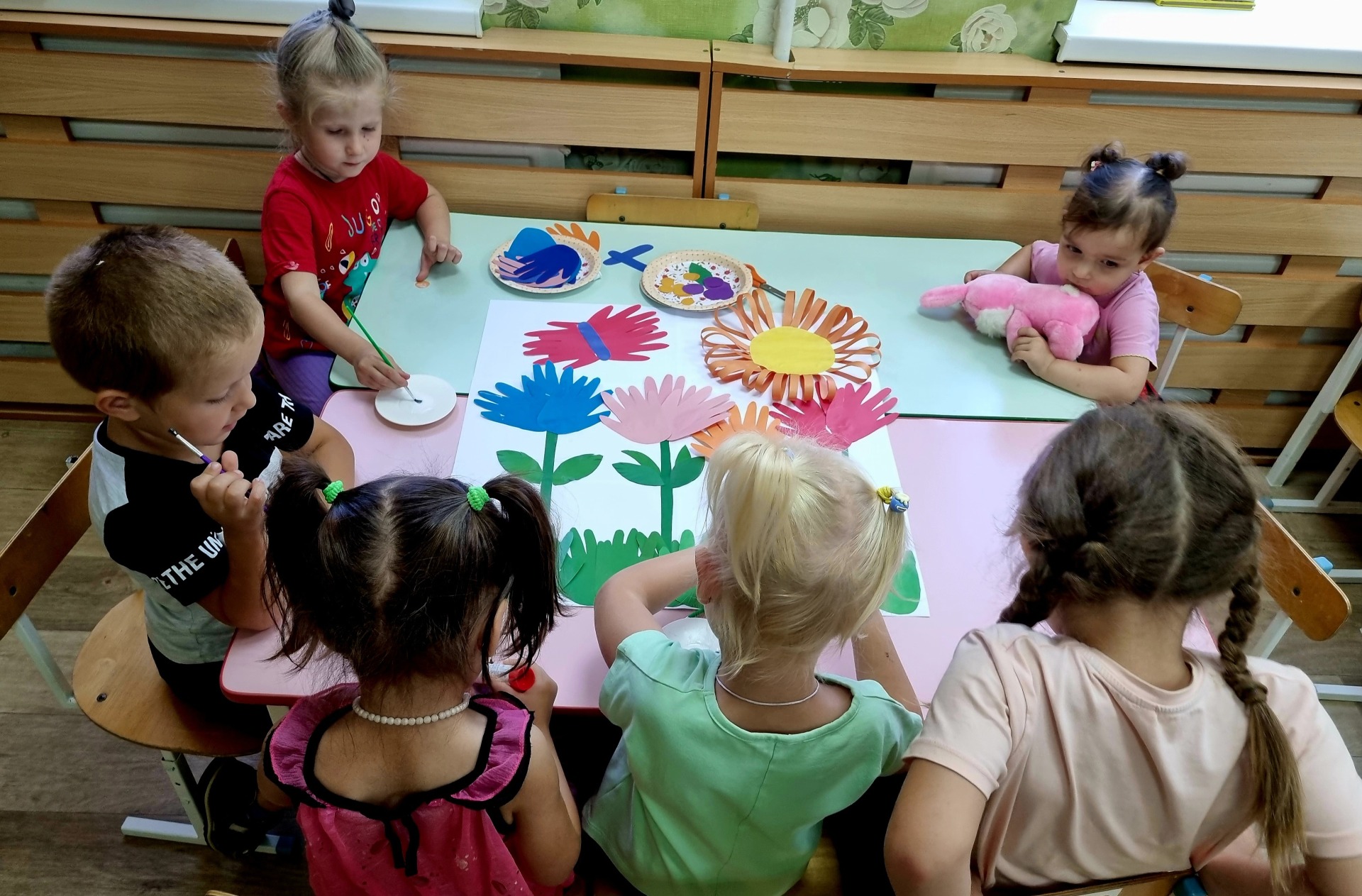 В последний день лета ребята делали коллективную аппликацию. Развивали умение составлять композицию, распределяли обязанности во время работы. Воспитывали бережное отношение к природе, аккуратность. Обогащали знания о лете. Композиция вызвала положительные эмоции воспоминаниями о лете, пробуждая эмоциональную отзывчивость детей. Дети укрепляли кисти рук, развивали мелкую моторику.